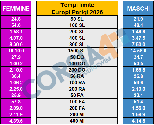 Per l’Europeo di vasca lunga, gli Assoluti sono un vero e proprio mini-trials: chi vince si qualifica direttamente per Parigi 2026, senza necessariamente passare dalla “spada di Damocle” del tempo limite. Per i secondi classificati, la speranza è quella di nuotare meglio del limite tabellare, così da scongiurare l’esame di riparazione del Settecolli, quando si potrà completare la lista facendo il tempo limite oppure convincendo il DT a proporre la candidatura alla FIN.