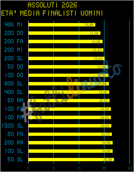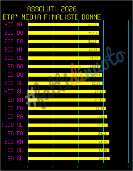 La gara più giovane sono i 400 misti maschi, 19,9 anni di età media finalisti, mentre la più vecchia i 50 stile sempre maschi, 25,3 anni.