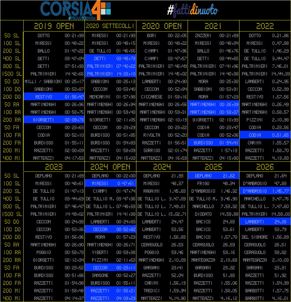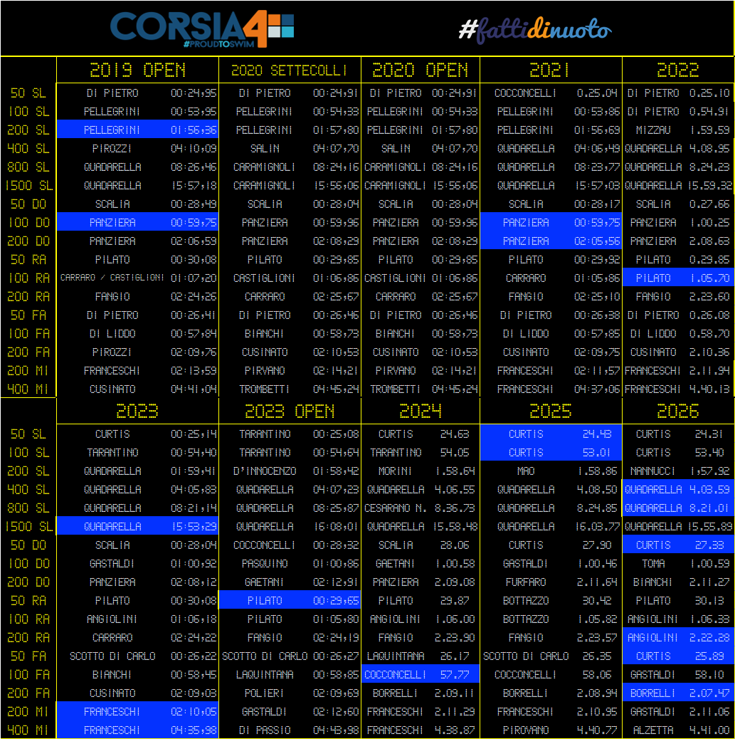 Riccione, però, di sentenze ne ha fornite parecchie, e se in alcune gare si è registrato qualche passaggio a vuoto (pensiamo, ad esempio ai 100 e 200 dorso donne), in altre il movimento ha risposto molto bene. Parlo ovviamente dei quattro record italiani assolutiLamberti nei 50 dorso, Angiolini nei 200 rana, Curtis nei 50 dorso e 50 stile – ma anche della pioggia di migliori prestazioni personali uscite dalle corsie romagnole.