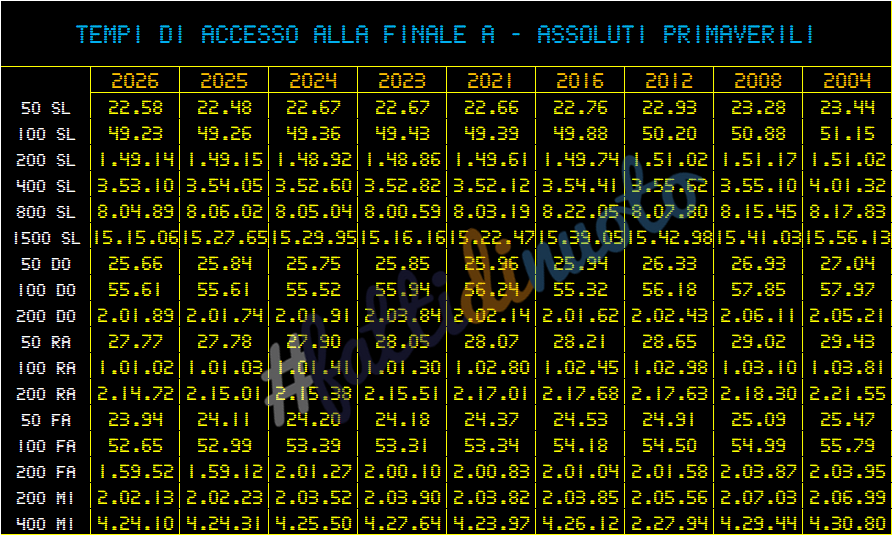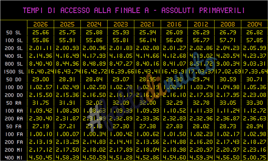 Da notare, per esempio, il confronto tra 2026 e 2025: in 13 gare su 17 tra i maschi, e in 10 su 17 tra le femmine, l’accesso alla finale di questa edizione era più basso rispetto a quello dell’anno scorso.